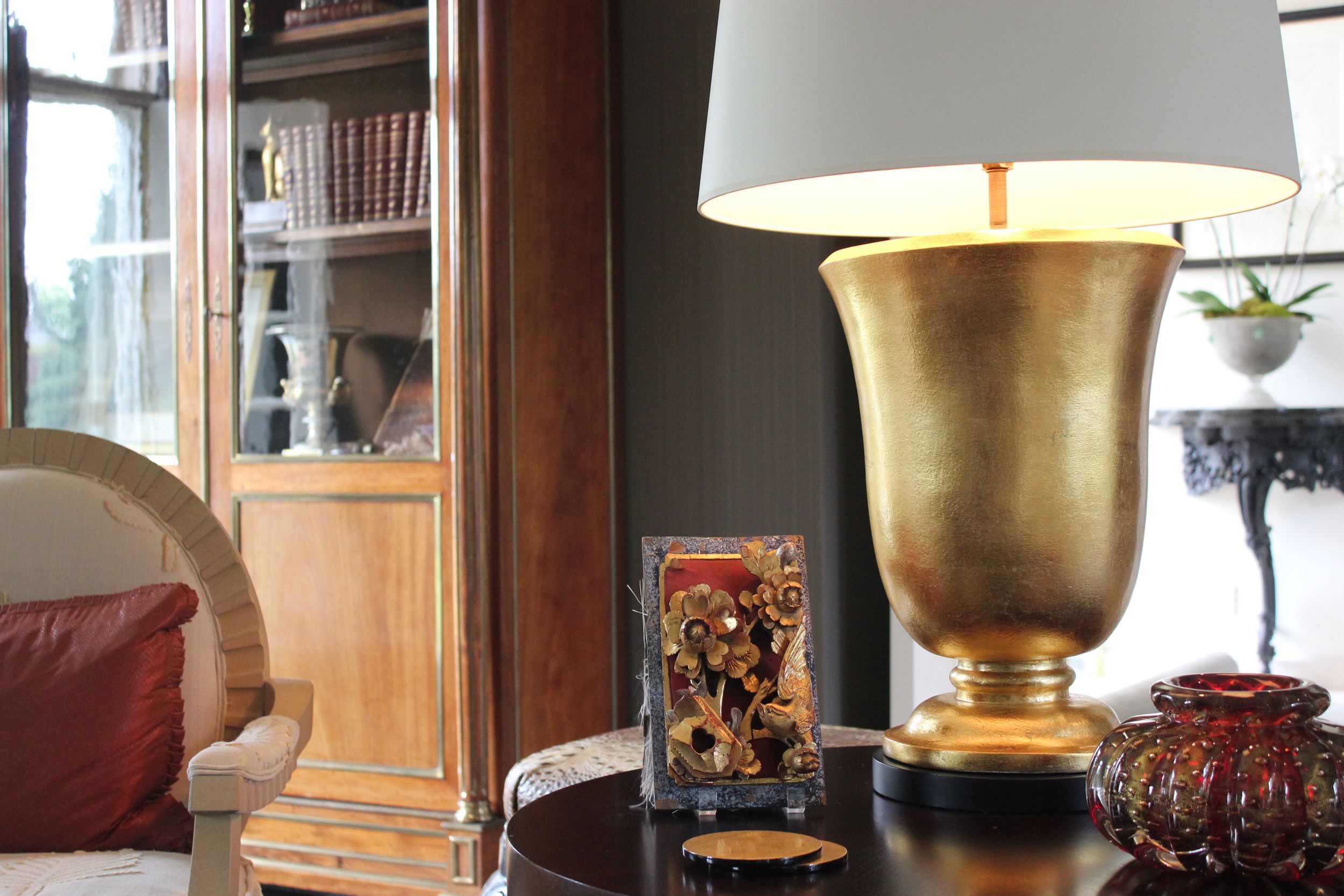 This statement piece showcases hand-applied gold leaf that transforms a simple object into a standout feature. The rich metallic surface adds warmth and pairs beautifully with surrounding décor for a cohesive, high-end feel.