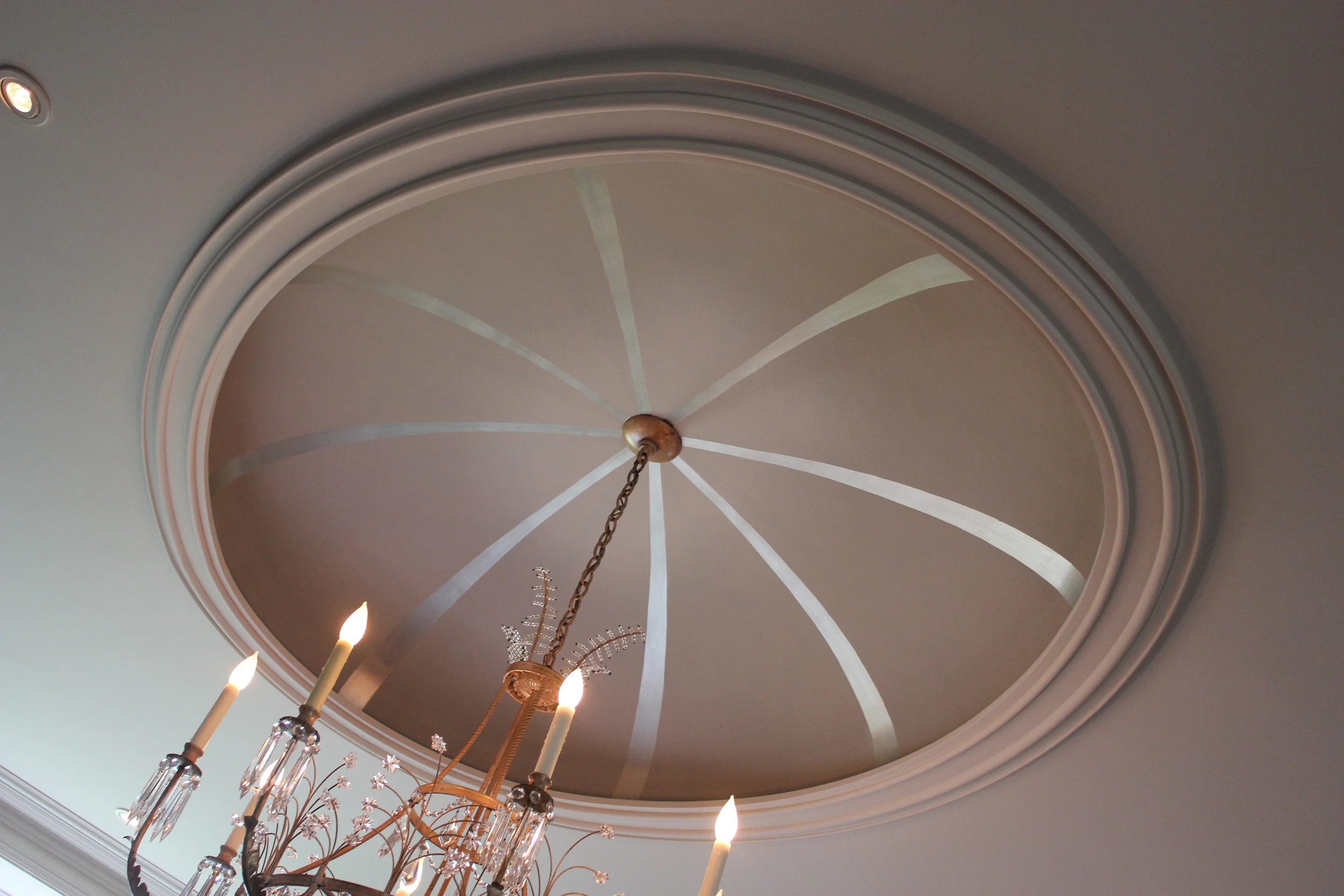 A modern take on gilding, this ceiling design incorporates soft metallic detailing to create depth and movement. The understated finish reflects light gently, adding interest and luxury to an otherwise minimal space.