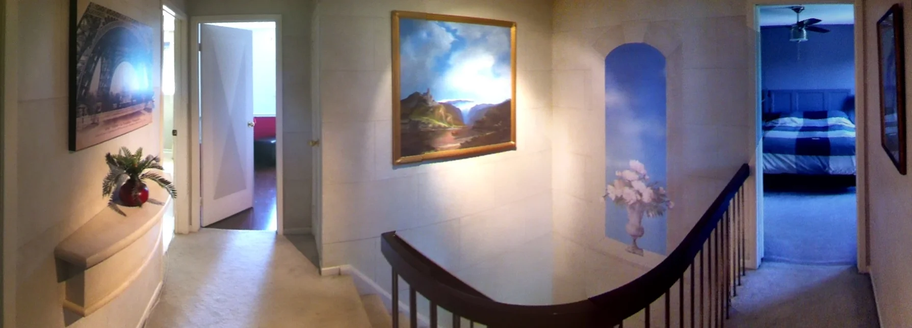 The Faux Limestone Finish continued up to the second floor and a window mural was added with a flower arrangement on the sill making the space feel even more open.